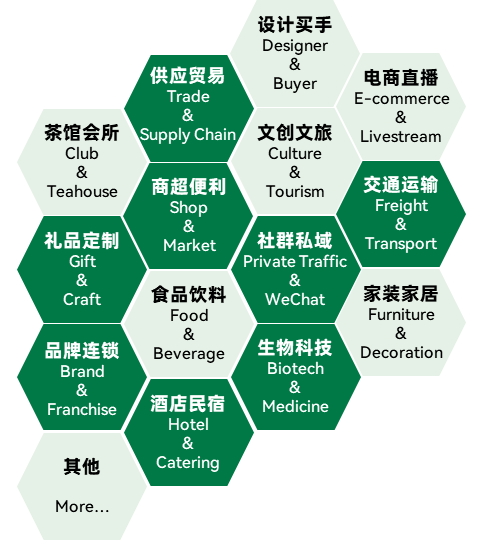 除了传统茶叶/茶器具/茶包装/茶空间/设计/茶楼/茶馆/会所/新茶饮/生物科技/食品/药品/农产品/化妆品/商超/旅游/餐饮/礼品/酒店/民宿/工艺品/装饰/装修/建材/金融业/文化传媒/政府/协会/院校/培训/贸易等行业买家之外,组委会还广泛邀请传统电商、跨境电商、社群团购、直播带货、各类买手、文创潮玩、时尚集合店、各消费品批发商/代理商......莅临本届厦门国际秋季茶博会参观采购,构建覆盖原厂定制、连锁加盟、跨界融合、跨境贸易、直播电商、节庆营销等众多场景的采购矩阵。这将是不可错过的茶行业年度选品采购黄金严选平台!